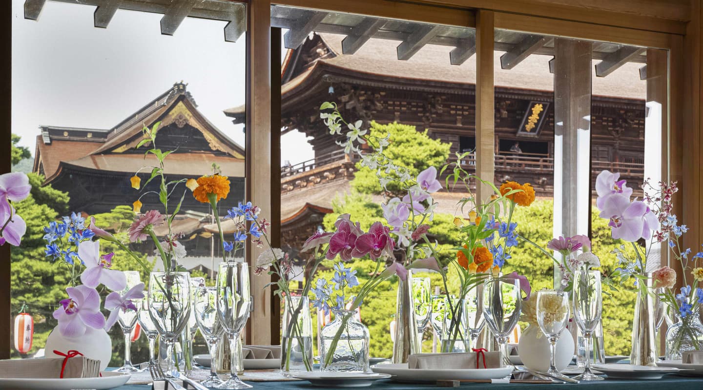 善光寺大勧進の結婚式事業は、国宝の善光寺でのロケーション撮影をはじめ、本堂の萬善堂で行われる厳かな挙式、そして境内にある披露宴会場「紫雲閣」での披露宴は1日1組様だけの特別なお時間としてご案内いたします。美食のイタリアンのフルコース料理は、和テイストを取り入れ、最高のおもてなしを目指しています。ご希望に応じて日本料理でのおもてなしも可能です。ご会食から披露宴までゲスト人数によって会場もご用意させていただき、貸切としてゆっくりとお過ごしいただけます。新郎新婦のおふたりをはじめ、ゲストの皆様にも人生の拠り所として末永いお付き合いをさせていただきたく精一杯努めております。